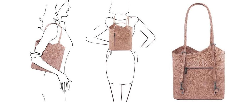 華やかなフローラル模様型押しレザーのショルダーバッグ。ショルダーストラップを取り替えることなく、するするスライドするだけでリュックになる便利なバッグです。