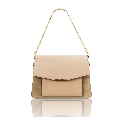 イタリア製スムースレザー&スウェード2WAYハンドバッグ ANDROMEDA、シャンパーニュ